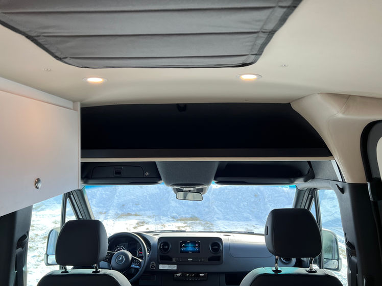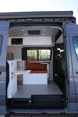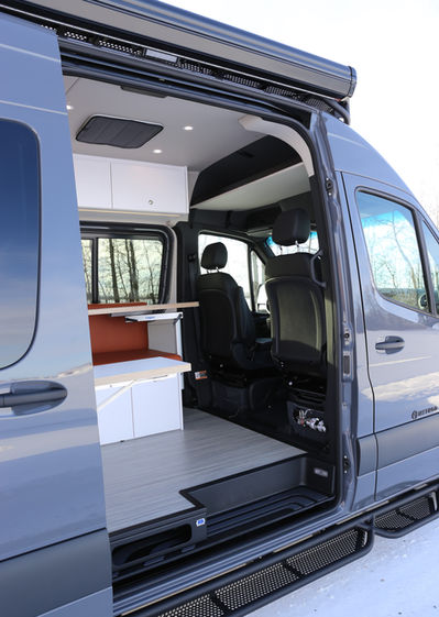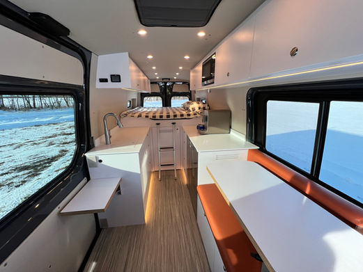 Thoughtful designs create a livable space for two in this custom 2021 Mercedes-Benz Sprinter 170. Inside, Intention features a generously sized bed constructed of 6” memory foam and 2 panel aluminum bed frames with standard depth extension pods creating increased bed length. The Sileather® upholstered sitting bench provides a comfortable and inviting spot to enjoy early morning coffee.